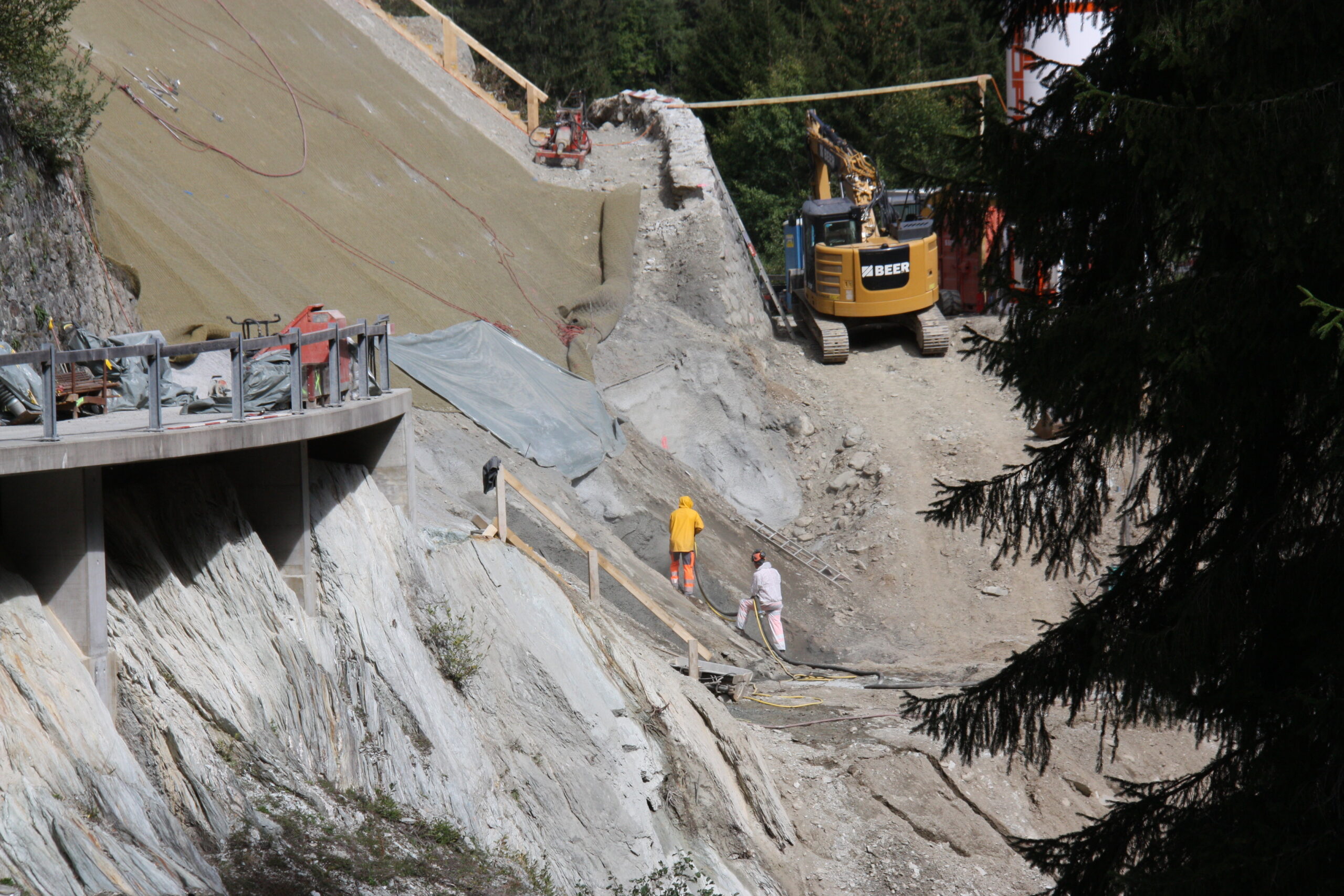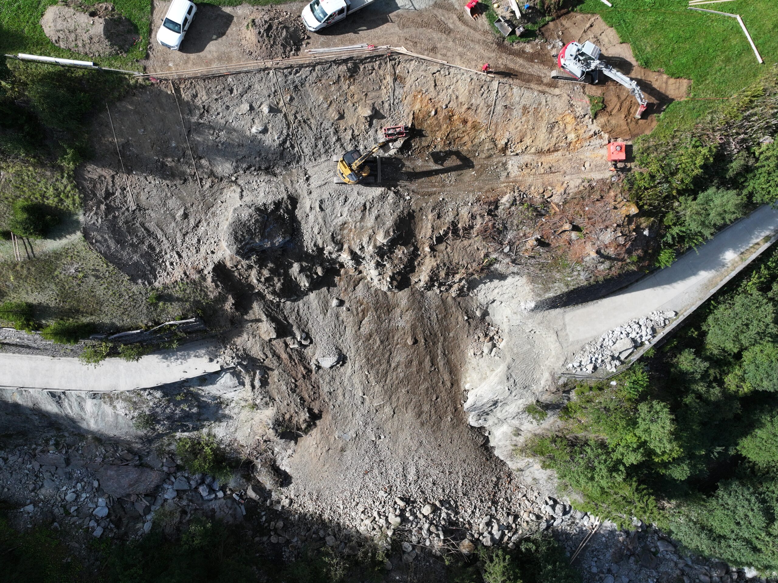 El liug han ils luvrers gest francau ina reit da segirtad silla scarpa per proteger ella dalla erosiun e per segirar la via da curdada da crappa. Ils fundaments per ils novs pilasters dalla punt ein en construcziun e l’interpresa da baghegiar ha era francau ancras el grep per la nova punt e per segirar il plazzal. Secapescha ch’ils cuosts per reconstruir la via sbuada ein buca stai prevesibels. Patrick Schaniel ha getg ch’el vegni a presentar la damonda per in credit posteriur per la reconstrucziun dalla via a caschun dad ina proxima radunonza communala probabel il december 2025.